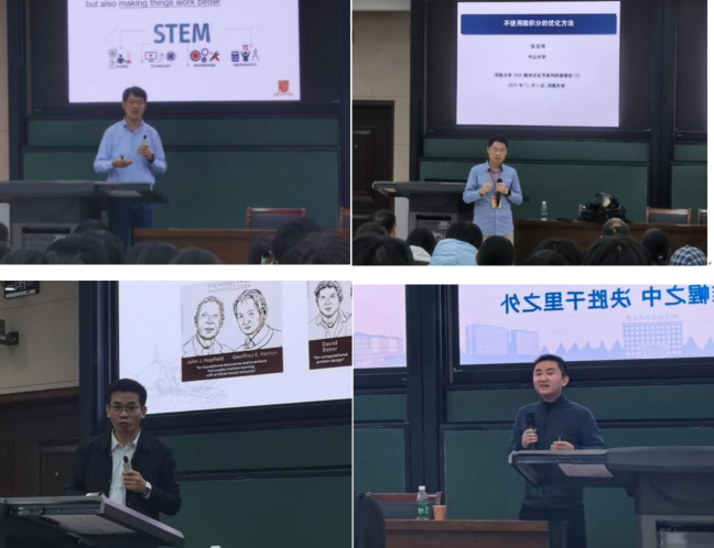 此外,在会议期间,苏文藻教授、张在坤教授、夏勇教授和朱利平教授应邀参加了河南大学的数学文化艺术节,并为本科生们奉献了四场精彩的科普报告。通过这些报告,四位教授不仅向学生们介绍了各自领域的最新研究成果,还深入浅出地讲解了数学及相关学科的实际应用,极大丰富了艺术节的内容。