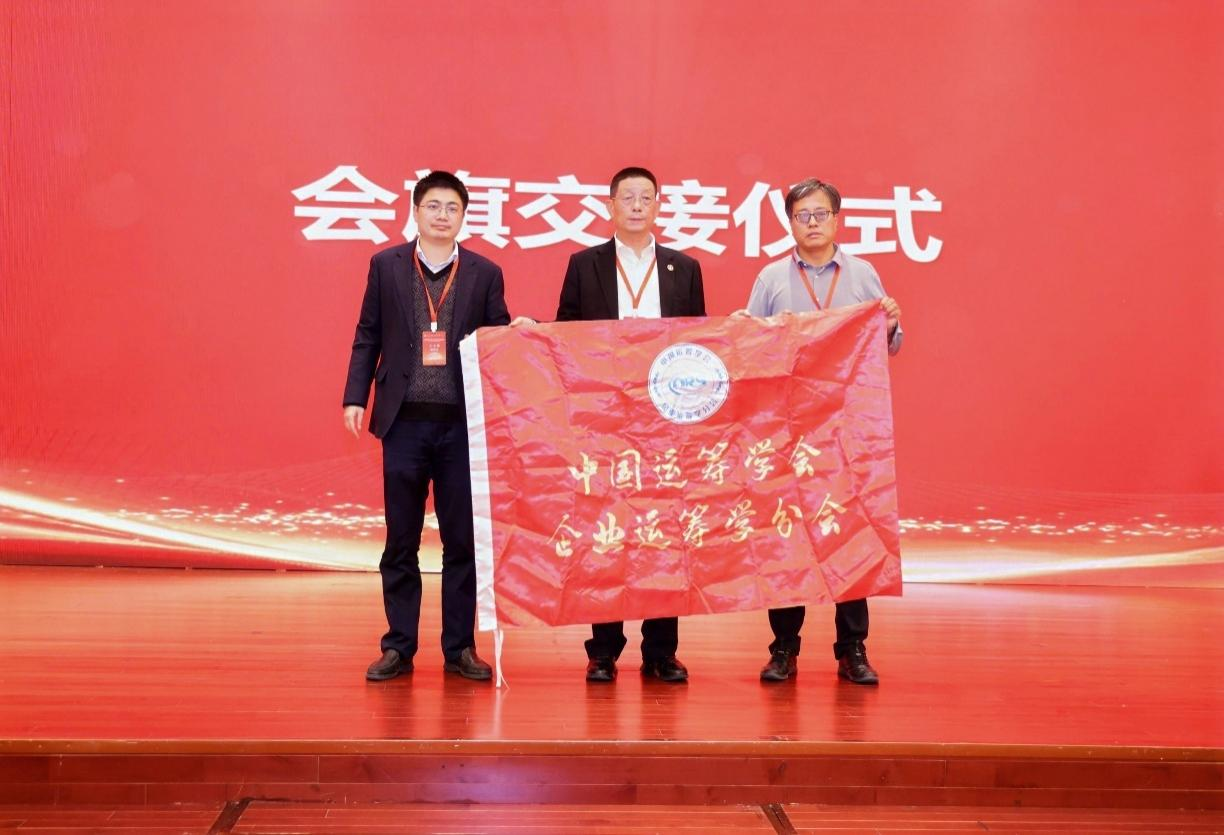 图17 中国运筹学会企业运筹学分会理事长与本次年会承办方代表将会旗交给第十九届年会承办方西安电子科技大学代表
