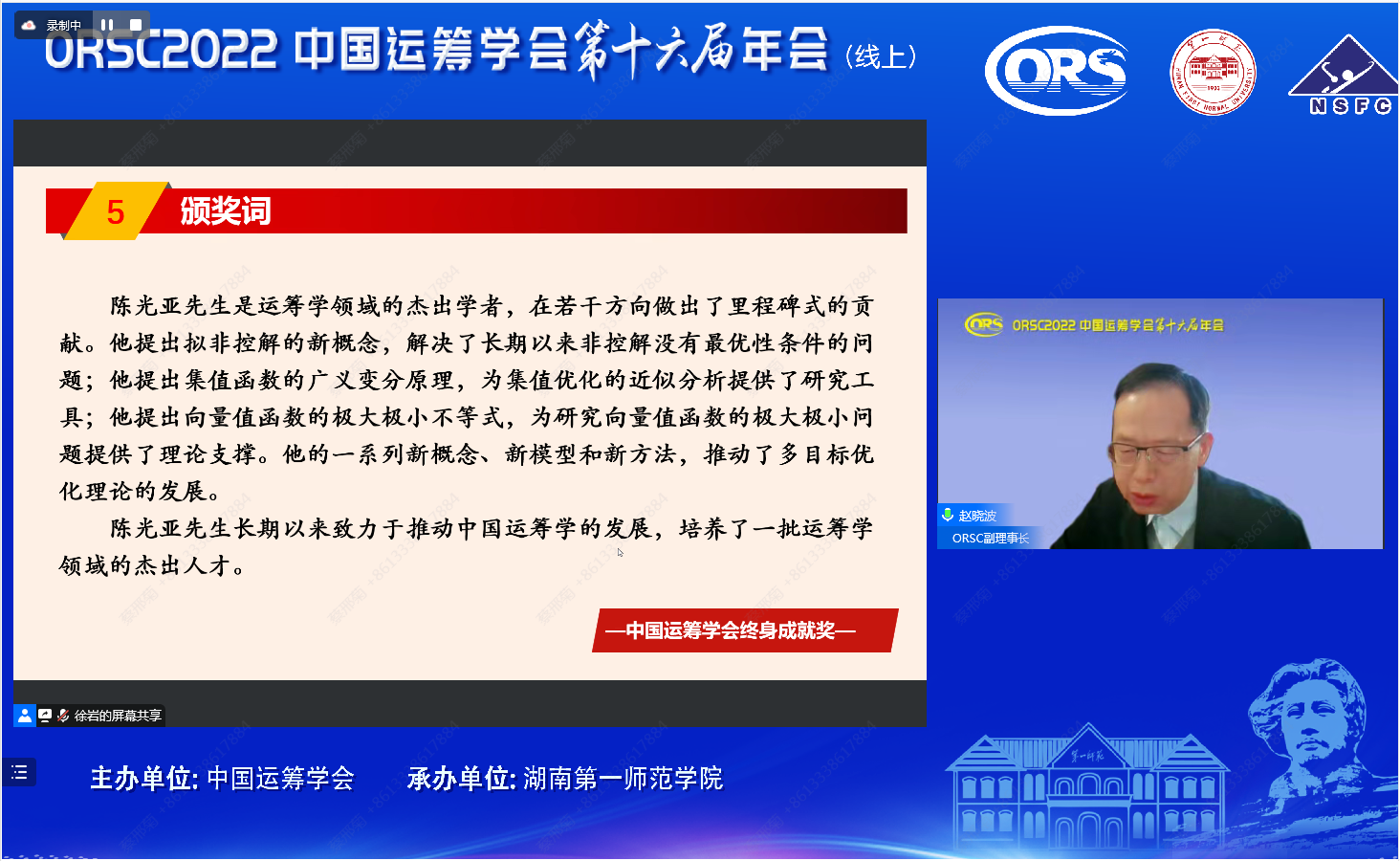 中国科学院数学与系统科学研究院陈光亚研究院荣获终身成就奖,中国运筹学会党委书记、副理事长赵晓波教授宣读颁奖词。