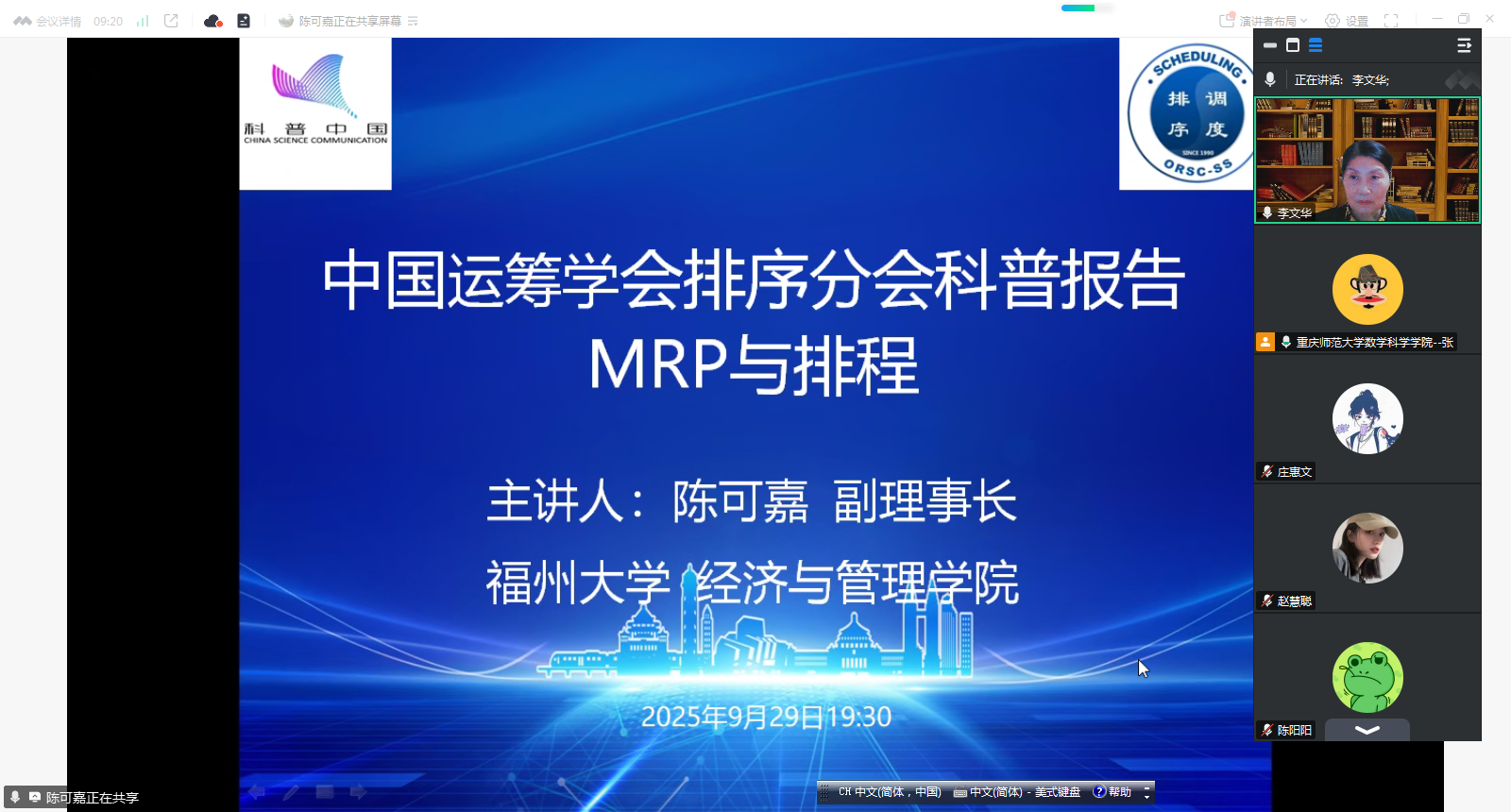 9月29日,由中国运筹学会排序分会主办的2025年中国运筹学会排序分会科普报告圆满举行。该报告旨在普及排序与调度在企业管理中的实际应用,并推广其应用场景。排序分会的资深顾问唐国春教授、理事长李文华教授、副理事长马冉教授和陈可嘉教授均出席了此次活动。报告通过腾讯会议进行,并在B站同步直播,吸引了全国知名学者、业界代表及高校师生等百余人参与。本次活动由排序分会理事长李文华教授主持。